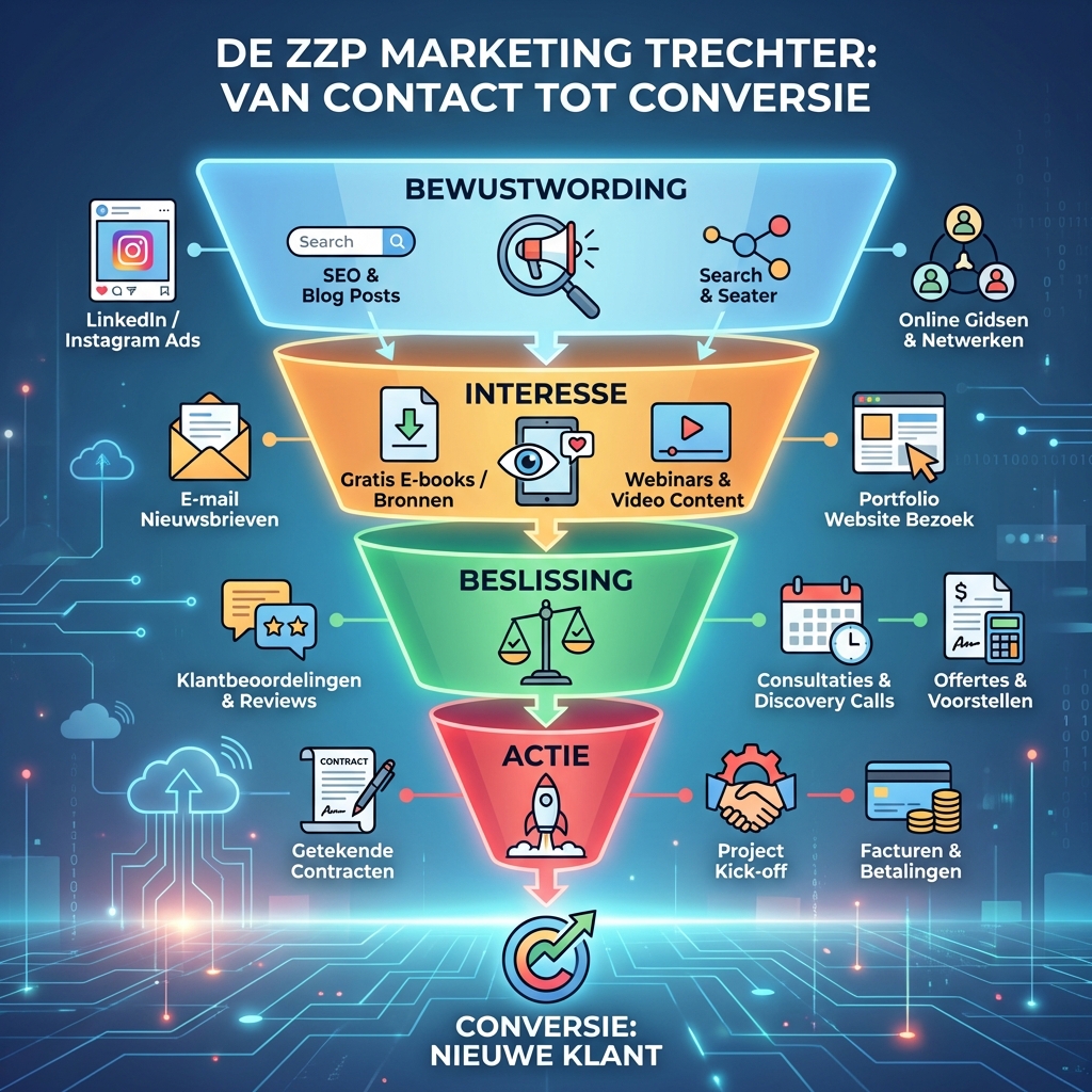 Continue klantenwerving is de brandstof voor je bedrijfsgroei. Zonder nieuwe klanten stagneert je omzet en mis je kansen om je diensten verder te ontwikkelen. Bovendien zorgt een gezonde instroom van nieuwe klanten voor spreiding van risico's - je bent niet afhankelijk van enkele grote opdrachtgevers.
